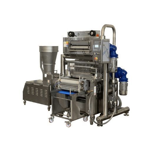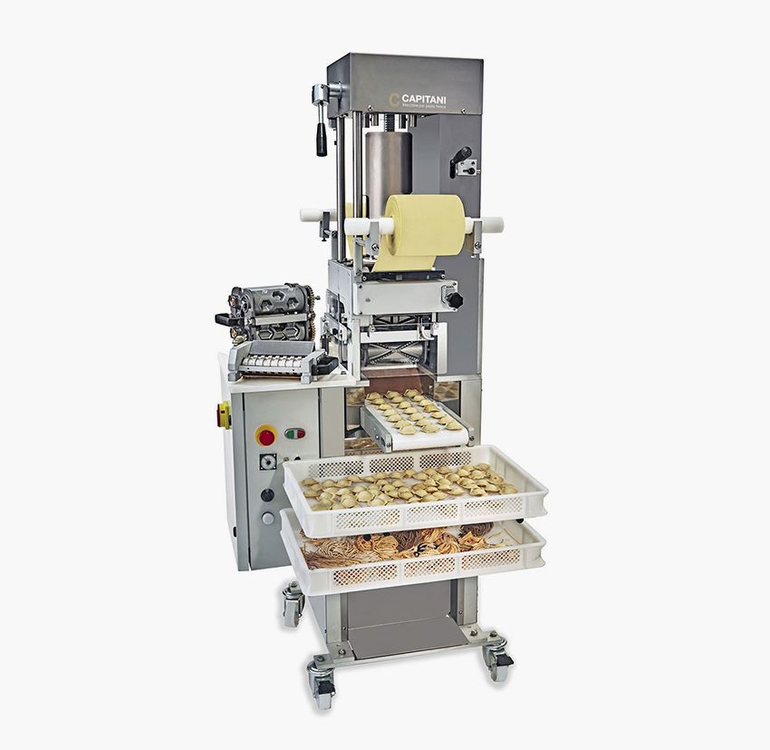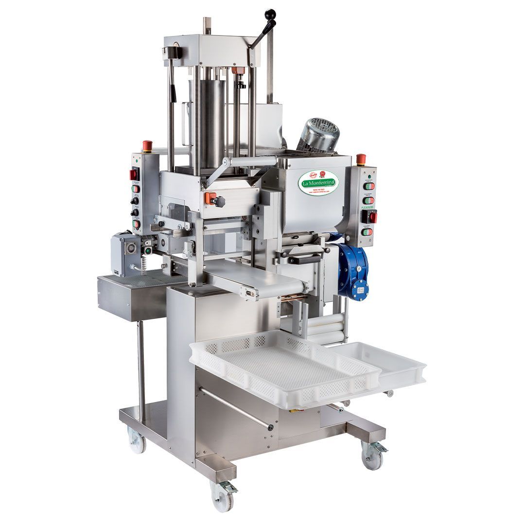 Machine pour la production de raviolis de différents formats, séparés individuellement ou en ruban, avec des farces à la viande et végétariennes, équipée d'un système de formes interchangeables.