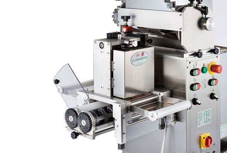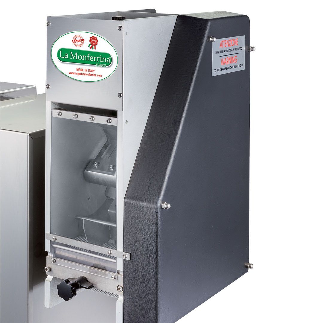 Stellt jede Art von extrudierter Pasta her, wobei nur die Matrize ausgetauscht werden muss (es sind Matrizen aus Bronze erhältlich, um eine rauere Pasta zu erhalten, und Matrizen aus PTFE für eine glänzendere und transparentere Pasta). Komplett mit rotierendem Teigschneidemesser für kurze Pasta.