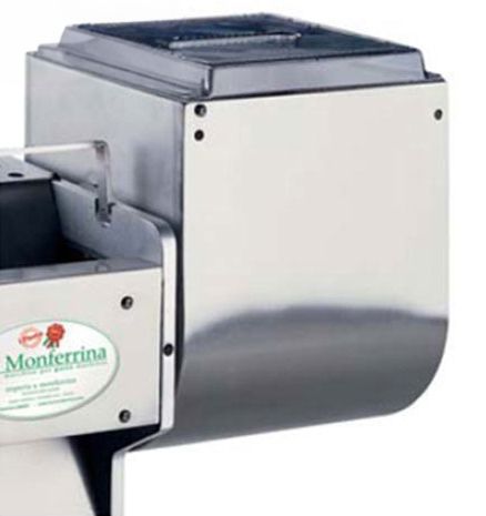 Stellt jede Art von extrudierter Pasta her, wobei nur die Matrize ausgetauscht werden muss (es sind Matrizen aus Bronze erhältlich, um eine rauere Pasta zu erhalten, und Matrizen aus PTFE für eine glänzendere und transparentere Pasta). Komplett mit rotierendem Teigschneidemesser für kurze Pasta.