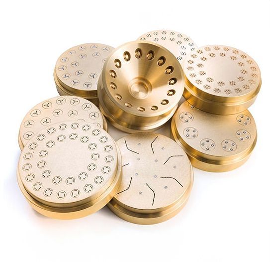 Die Trafile bestehen entweder vollständig aus Metall, um eine rauere Pasta zu erhalten, oder sie sind mit PTFE-Einsätzen ausgestattet, für eine glänzendere und transparentere Pasta.